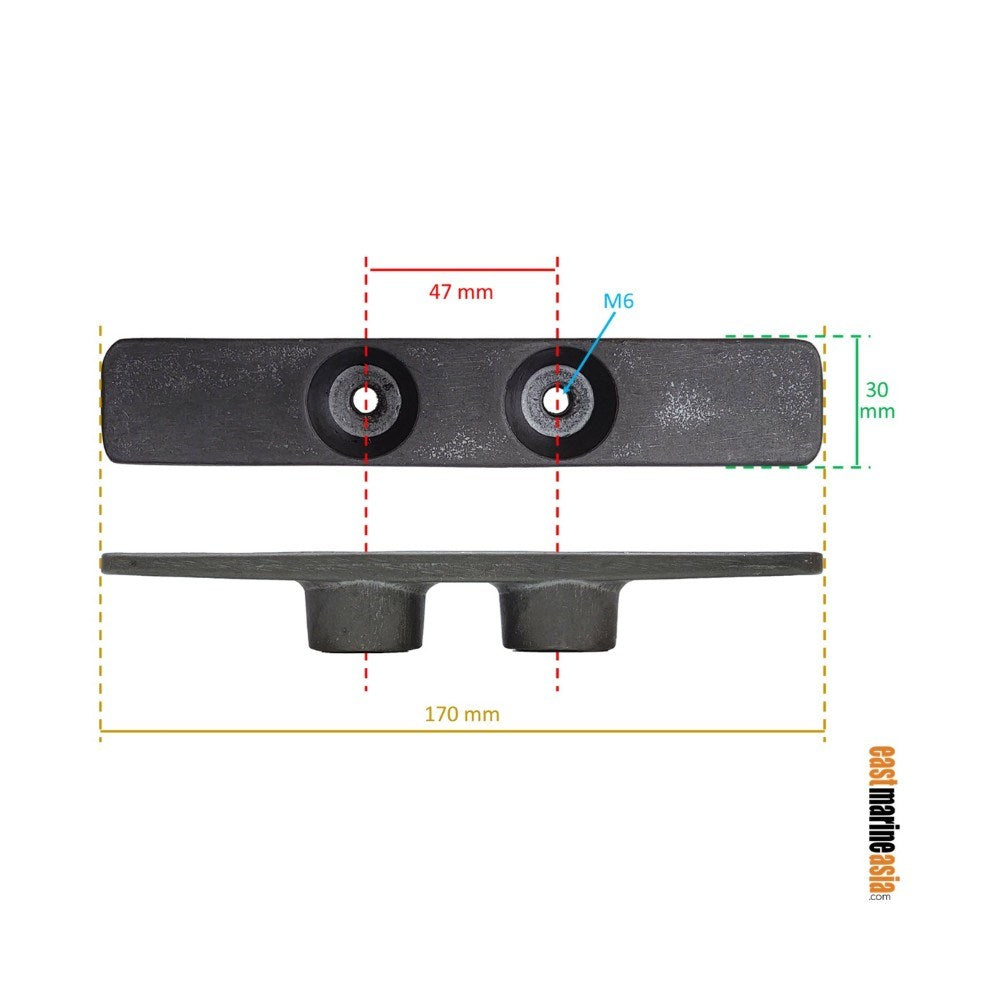 Z Spars 1081 - Aluminium spar cleat or mast cleat is 170 mm long x 30 mm wide, fastens with 2 x 6 mm fasteners on 45 mm hole centres.  Typically installed in the factory with a special deep-nosed rivet tool but can also be installed with machine screws.
